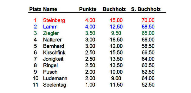 Es werden 5 Runden Schweizer-System je 60 Min gespielt. Dabei muss die vorgegebene Eröffnung fortgesetzt werden.